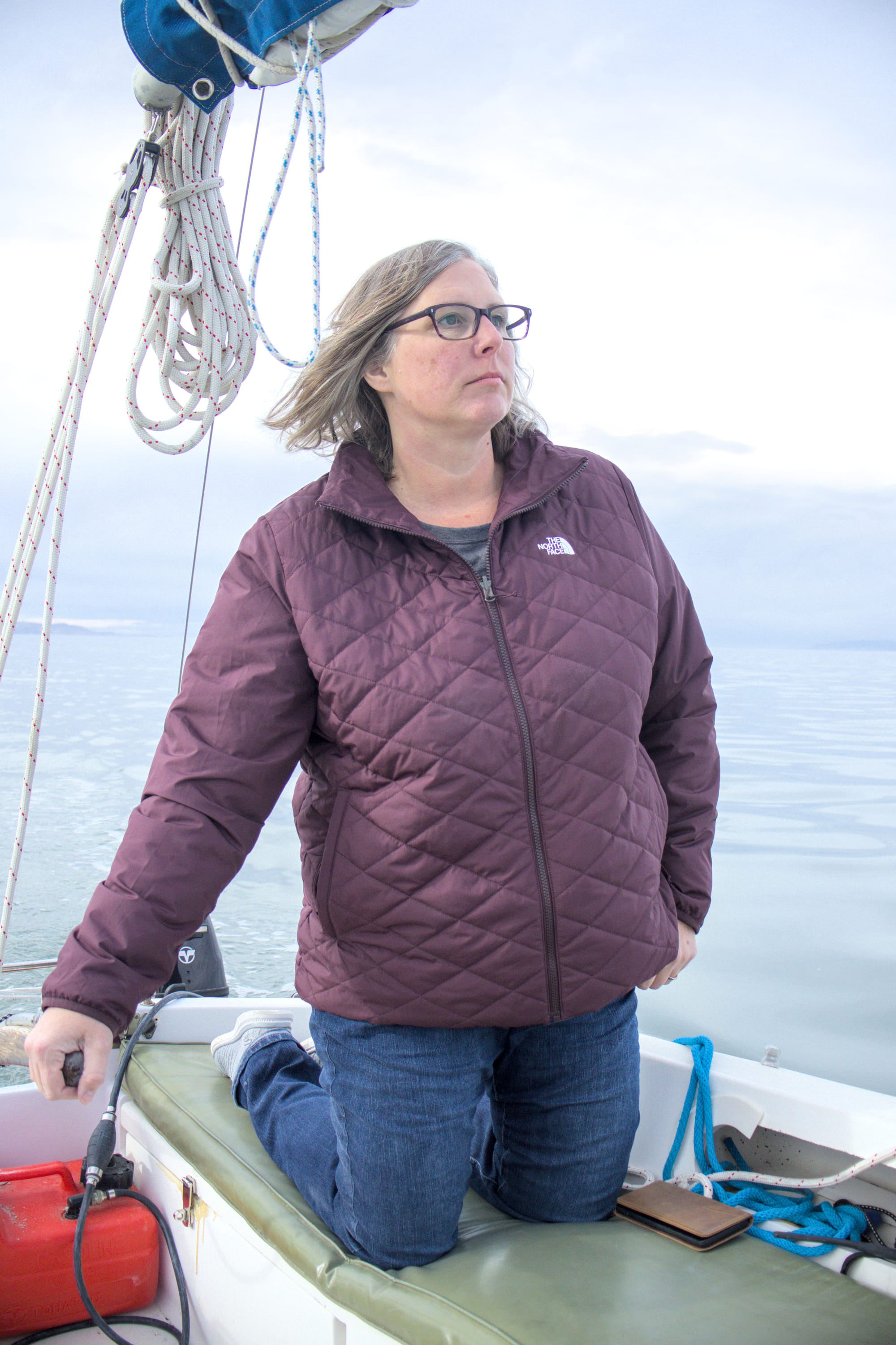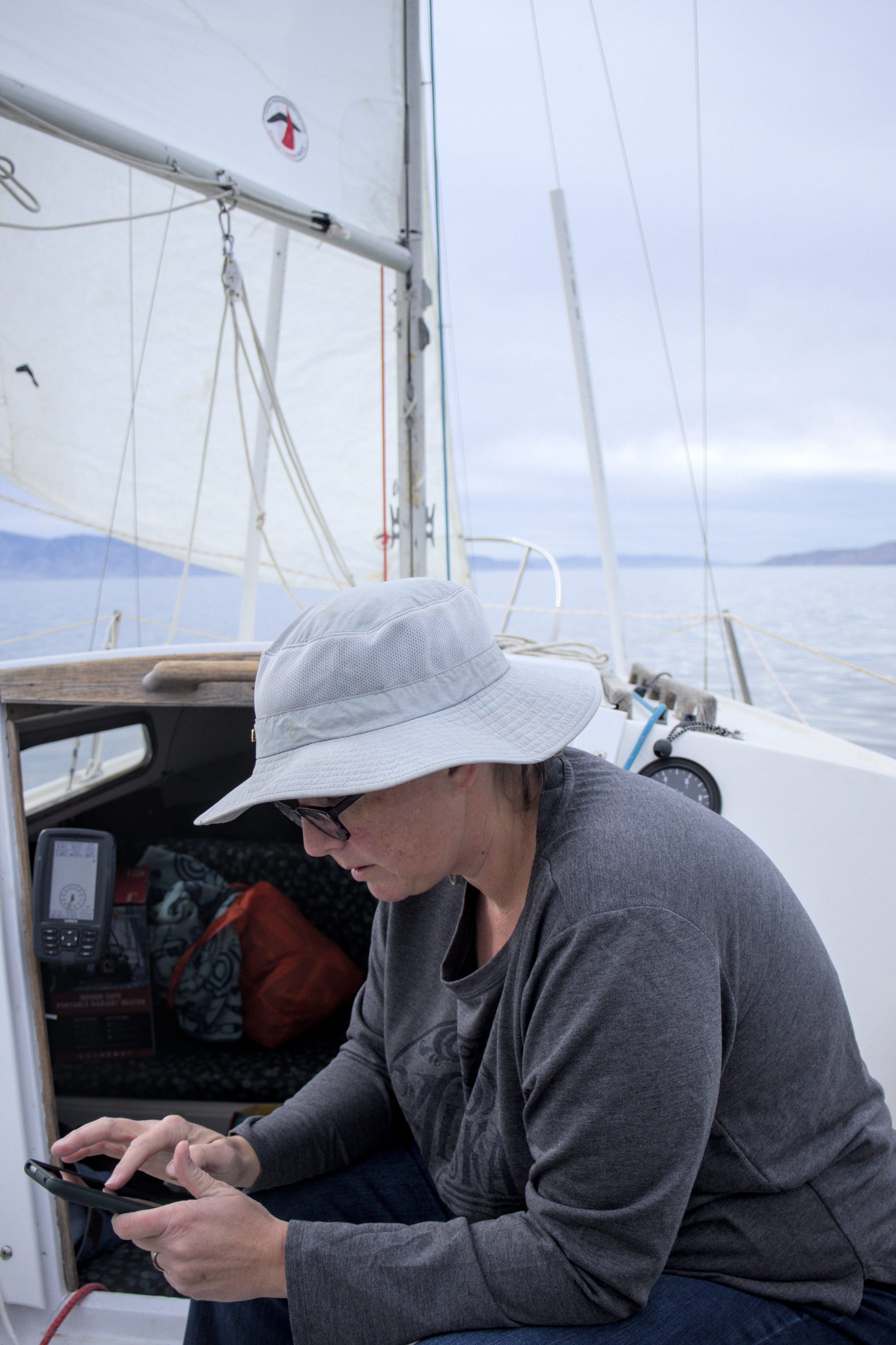 We sailed like that for about half an hour, then the wind picked up a bit more, and we reached about 1.5 knots, which at least felt like we were moving. After another half an hour, we turned a bit to the east, and the wind also started picking up more and more. Pretty soon, we were heading out at about 3.5 knots and having a lot more fun.