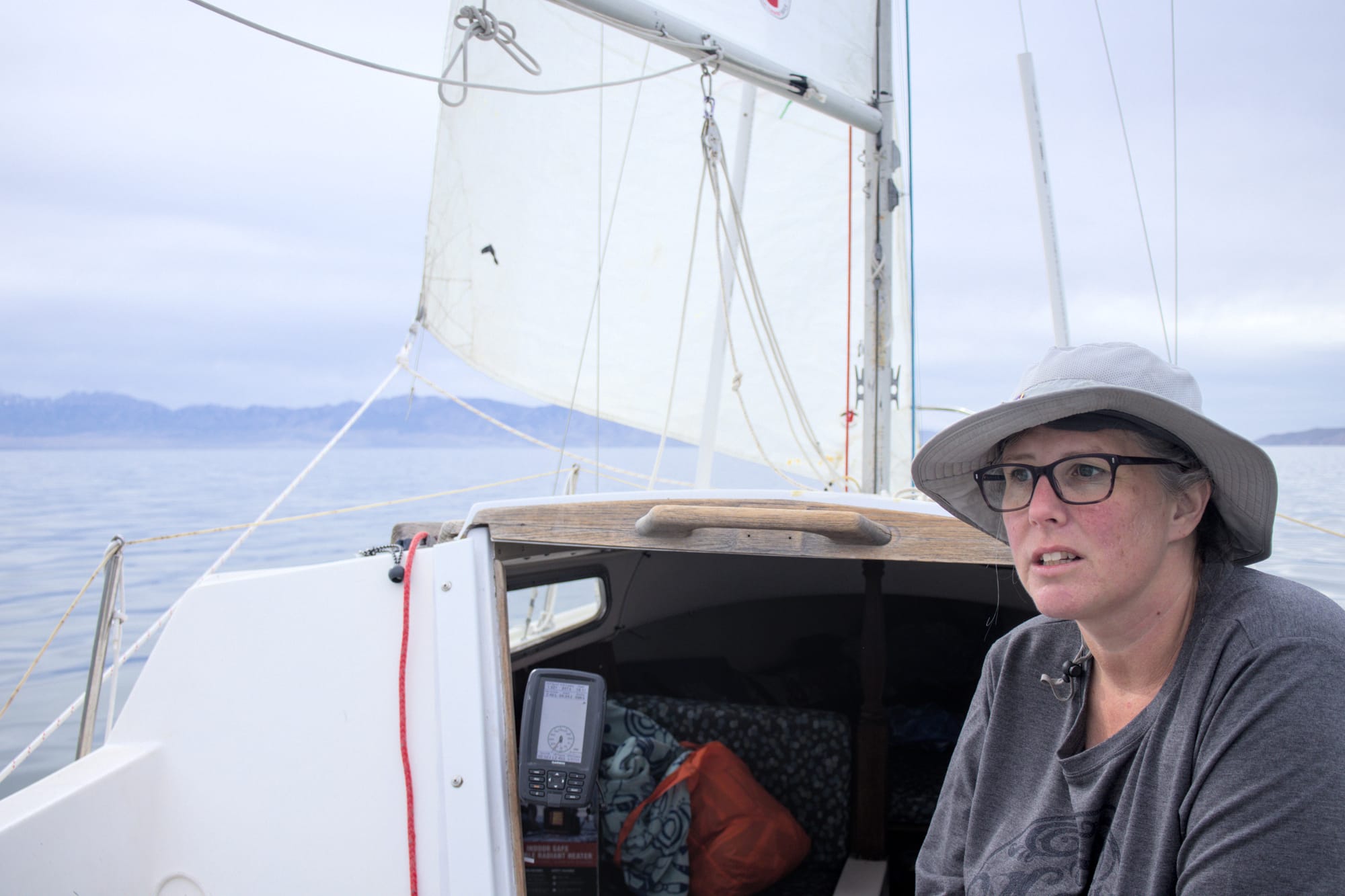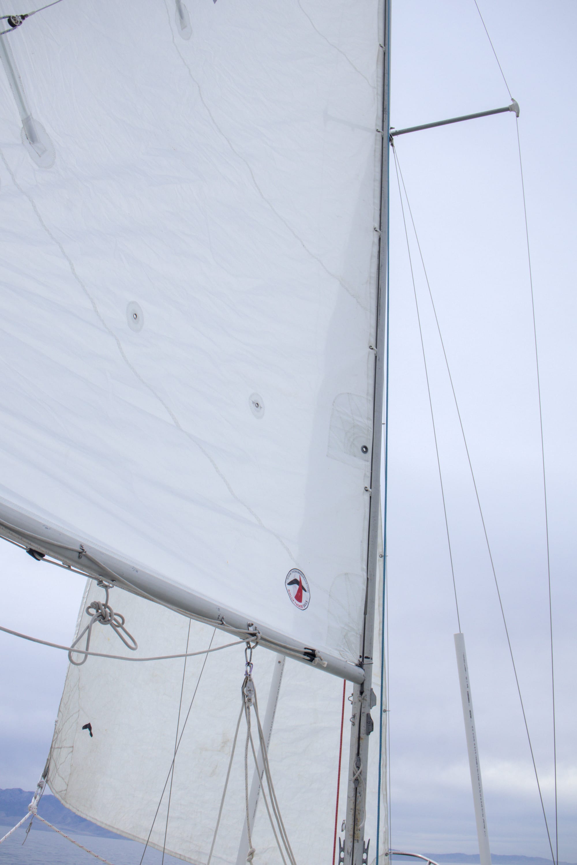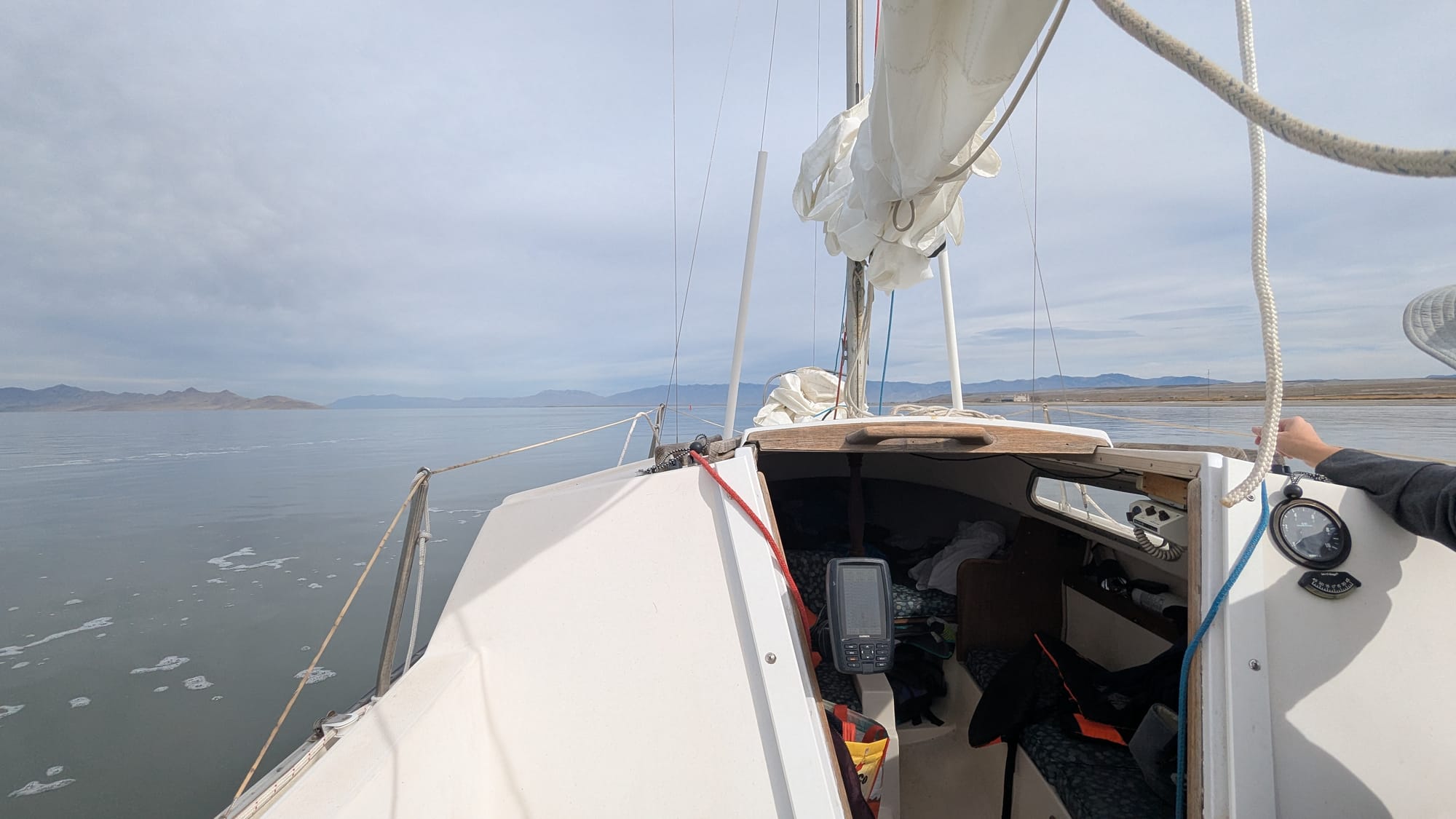 Once we were out, we slowed down and raised the sails. And.... they flapped with absolutely no wind. We turned back on the outboard and motored out until the sail filled. After that, we killed the engine and headed out at about .7 knots of speed, not a nail-biter by any stretch of the imagination.