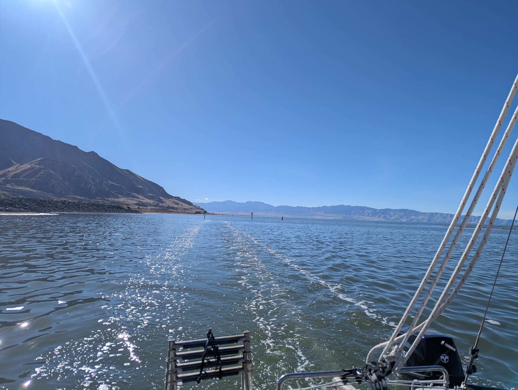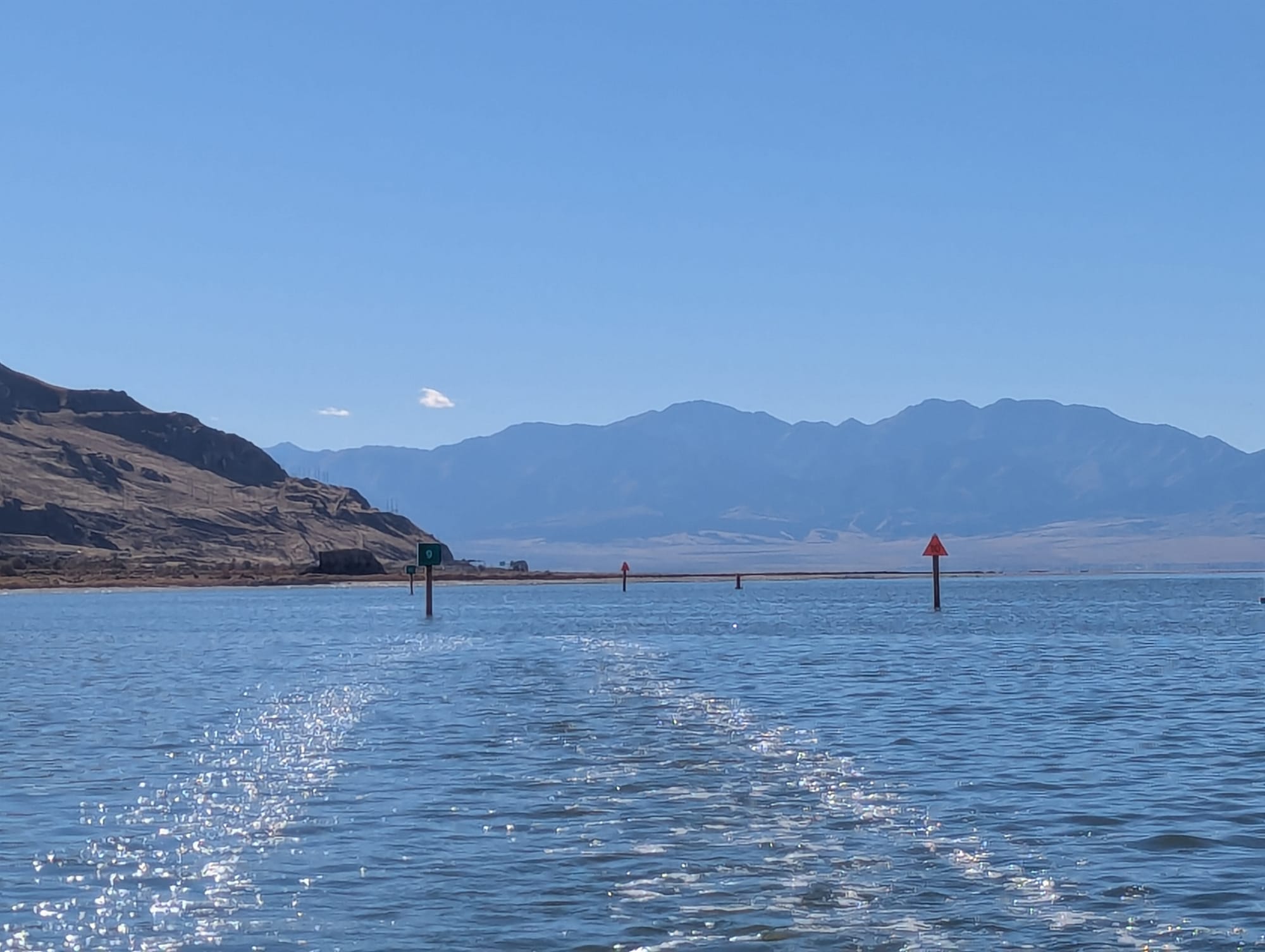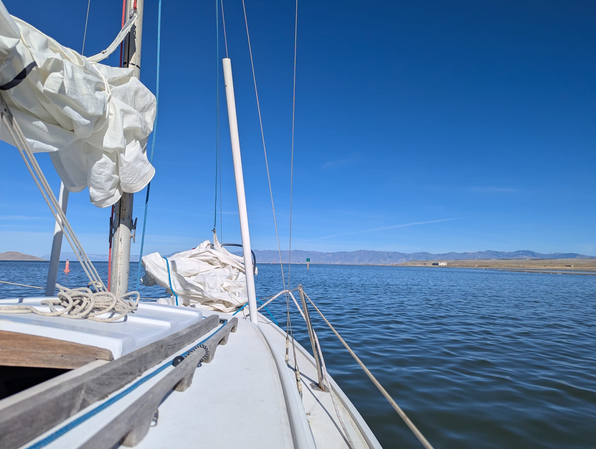 Channel Markers along the Great Salt Lake channel to the deep water. Image is taken from a sailboat that can be seen in several of the images.
