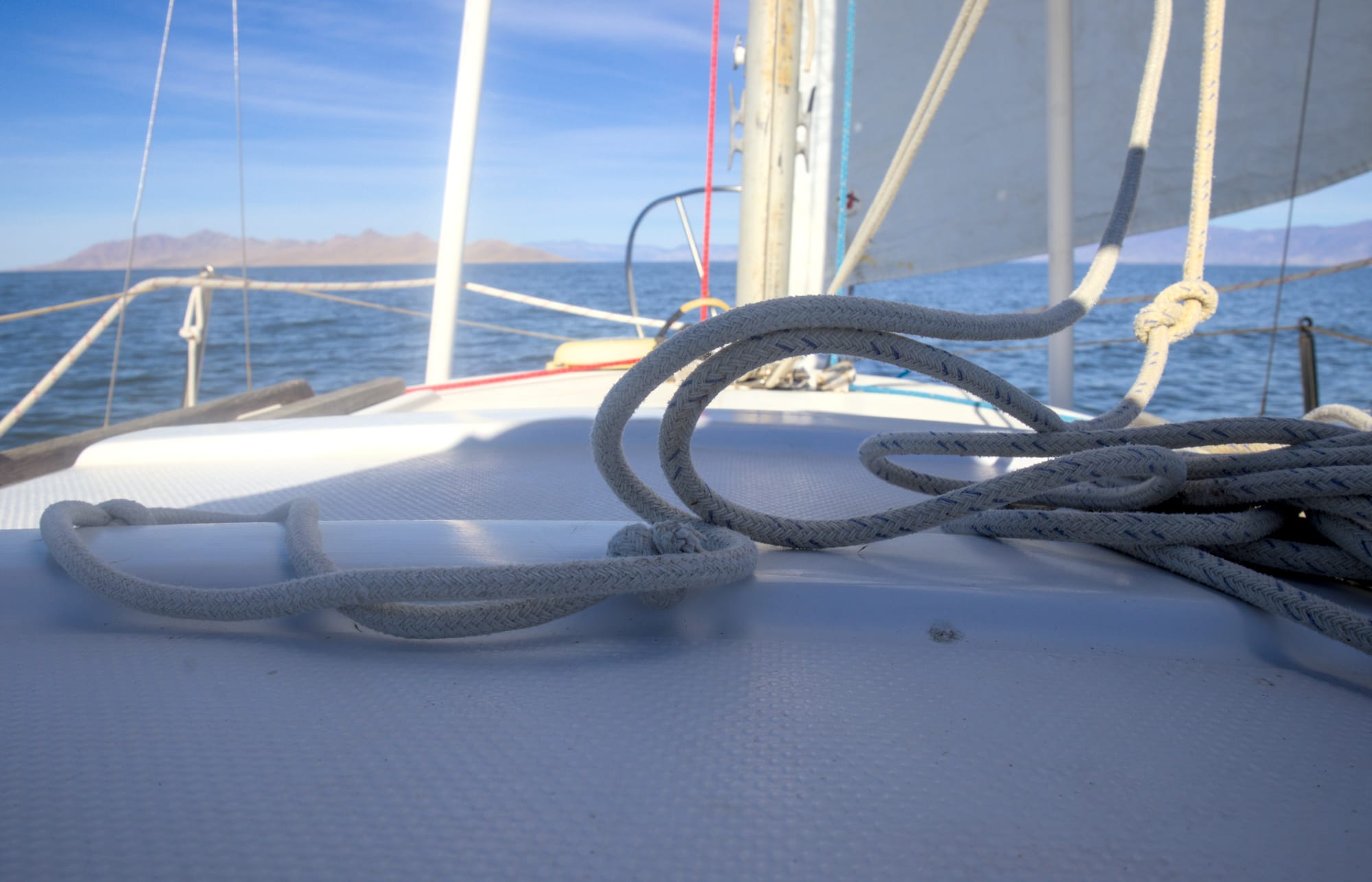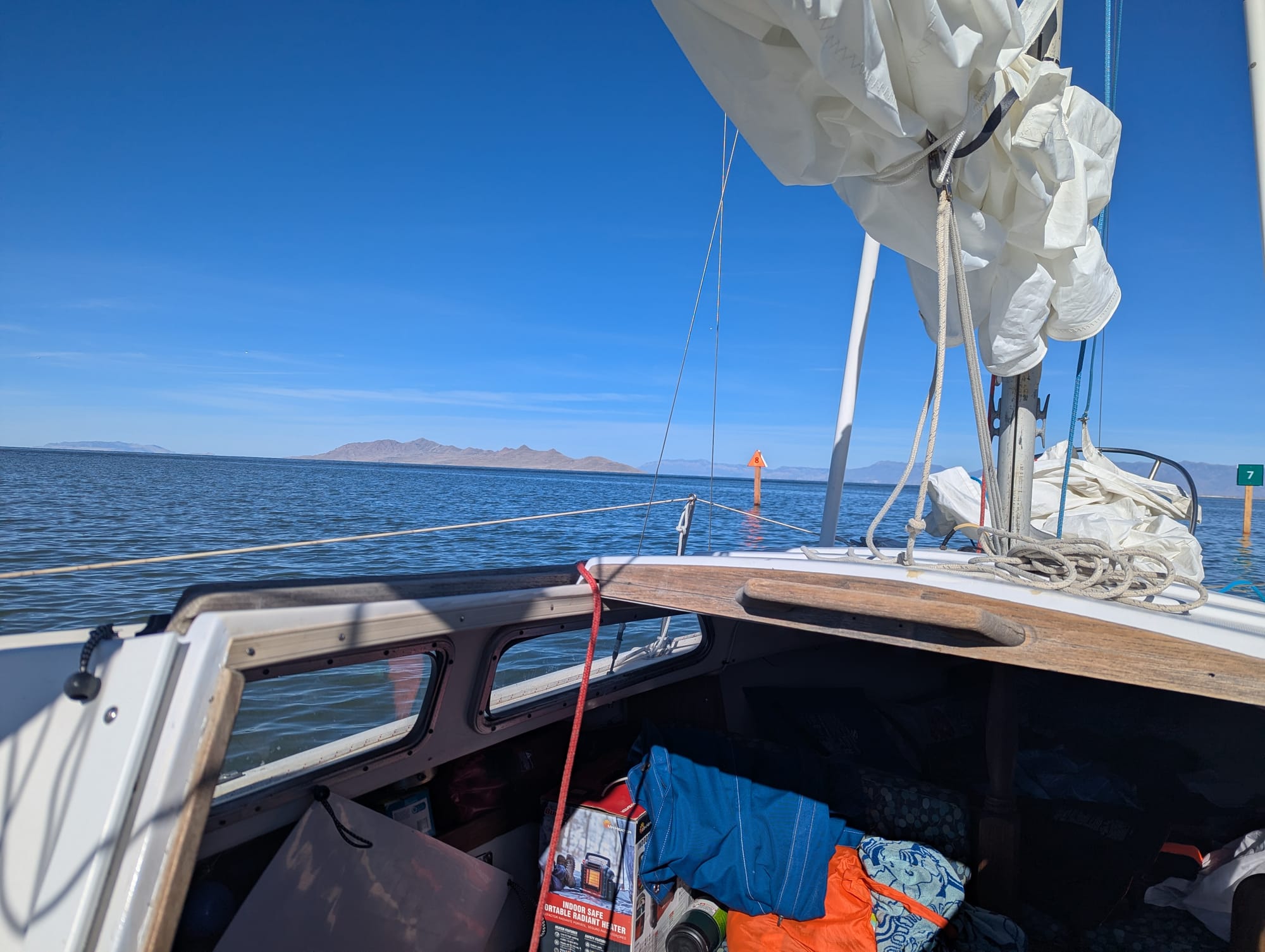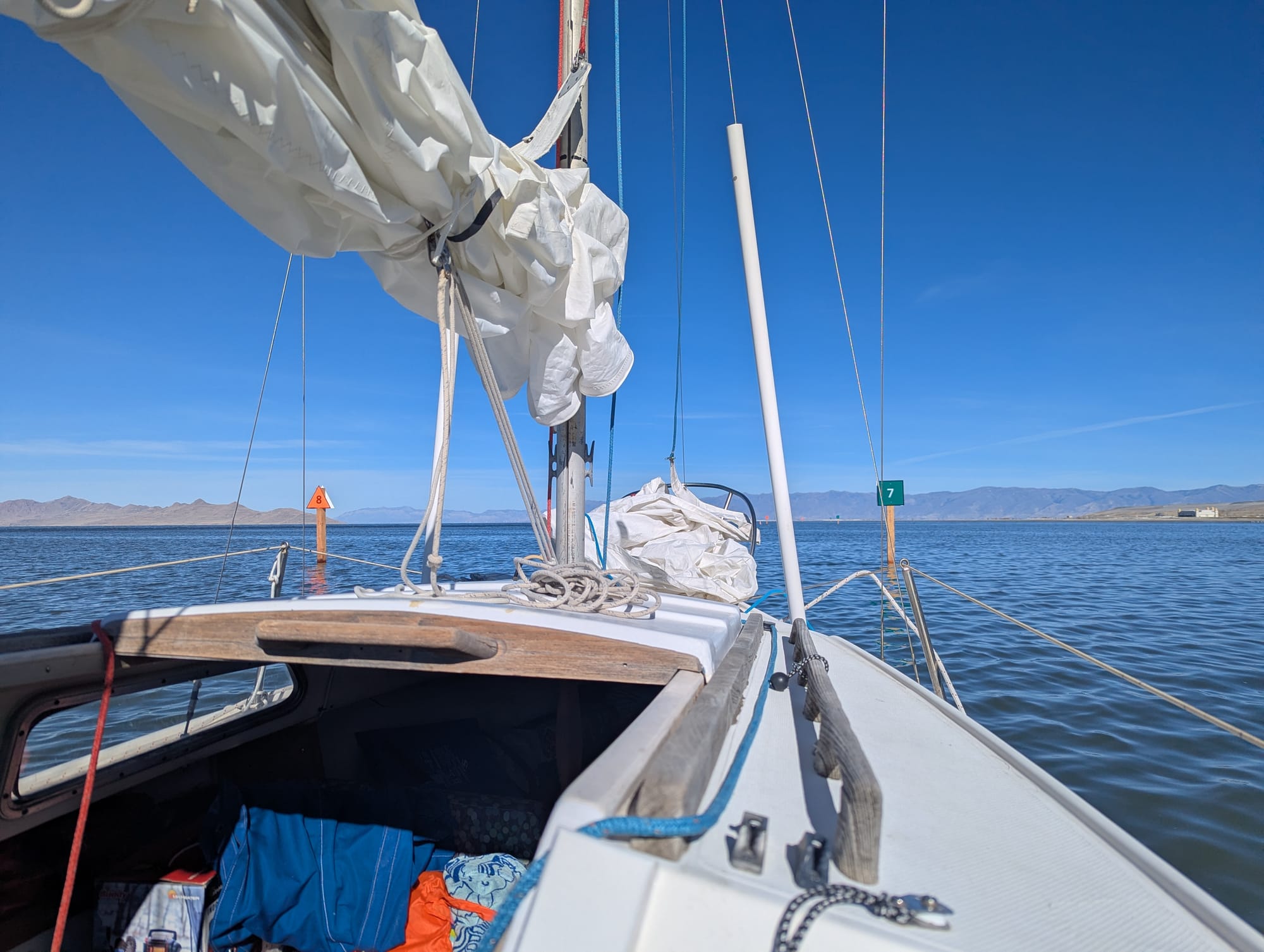 Channel Markers along the Great Salt Lake channel to the deep water. Image is taken from a sailboat that can be seen in several of the images.