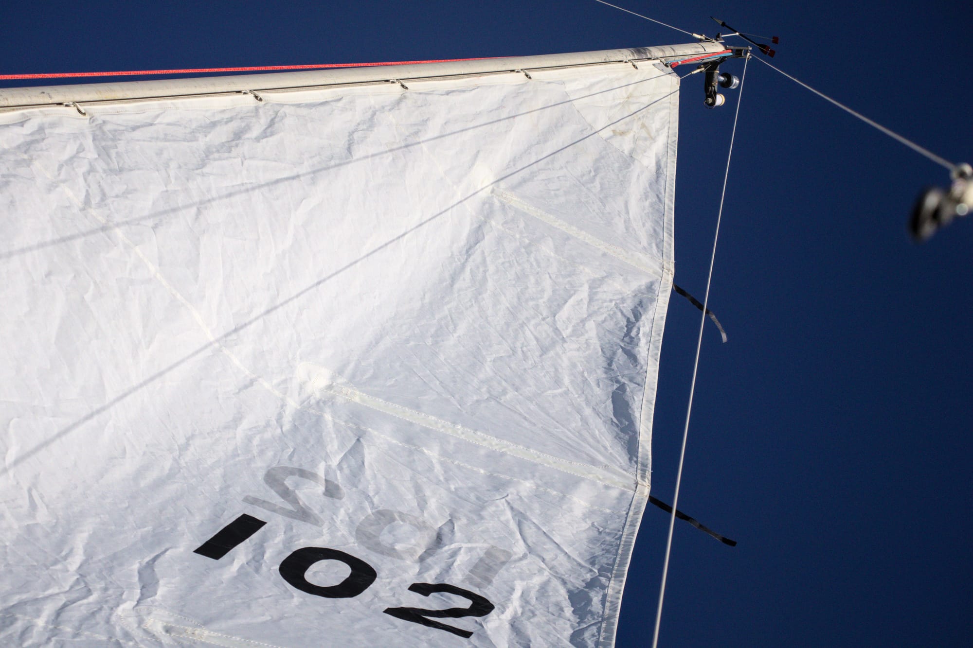 After my camera battery died, we headed back in. We were headed straight down wind, so Nikki tried out acting as a whisker pole with moderate success. Eventually, when we were close to the deep water markers, the wind had died enough, so we put down the sails.